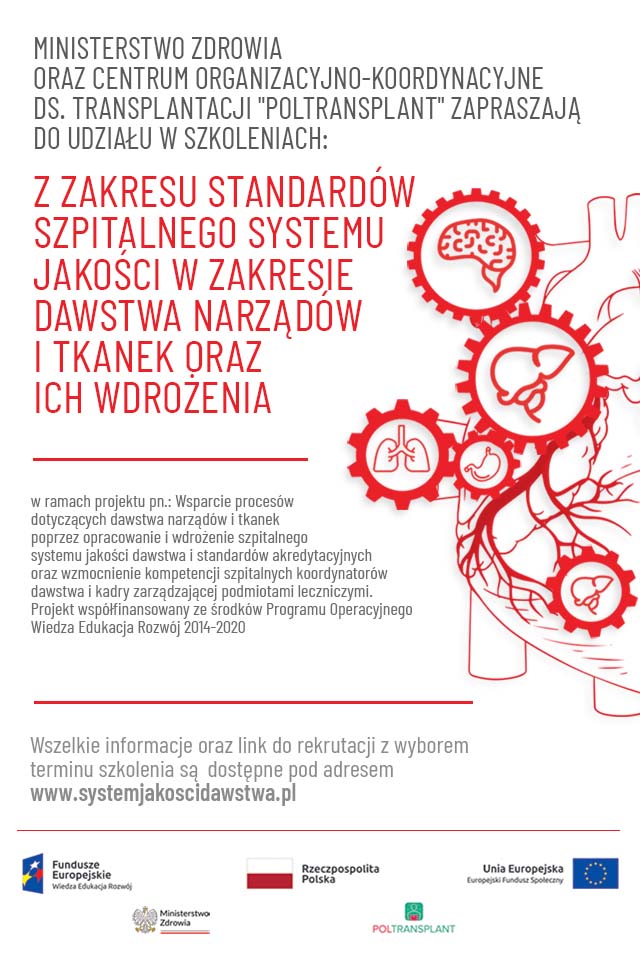 Ministerstwo Zdrowia realizuje projekt zatytułowany „Wsparcie procesów dotyczących dawstwa narządów i tkanek poprzez opracowanie i wdrożenie szpitalnego systemu jakości dawstwa i standardów akredytacyjnych oraz wzmocnienie kompetencji szpitalnych koordynatorów dawstwa i kadry zarządzającej podmiotami leczniczymi”. Projekt o wartości 5 900 000 zł współfinansowany jest ze środków UE w ramach Programu Operacyjnego Wiedza Edukacja Rozwój (POWER).